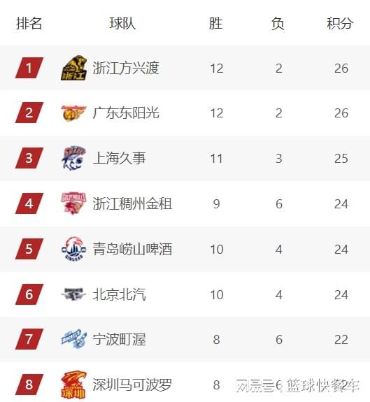 排在积分榜第四名的是浙江队,这一轮比赛,他们主场以89-74击败了广州队,成功拿到赛季第9胜,球队目前的战绩也变成了9胜6负,暂时杀回积分榜前四名。而排在积分榜第5名的是青岛队,他们的战绩则是10胜4负,北京队则紧随其后,排在积分榜第6名,他们的战绩也是10胜4负。不过,由于少赛一轮的缘故,青岛队和北京队在排名上稍微吃亏,暂时只能屈居浙江队身后。