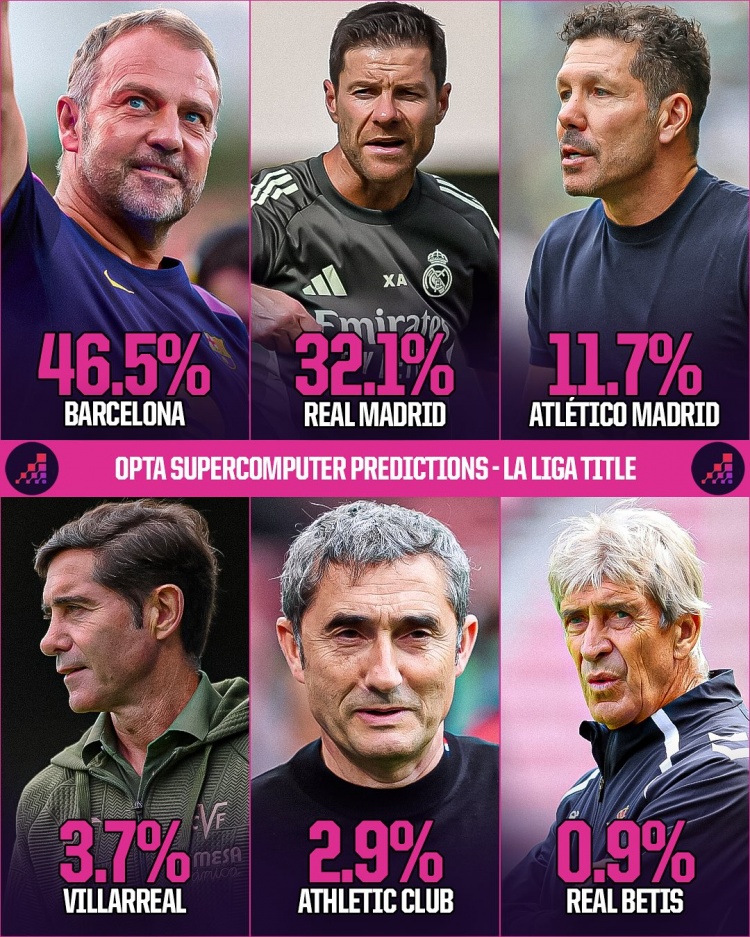 ■Opta超级计算机预测西甲夺冠概率完整榜单: