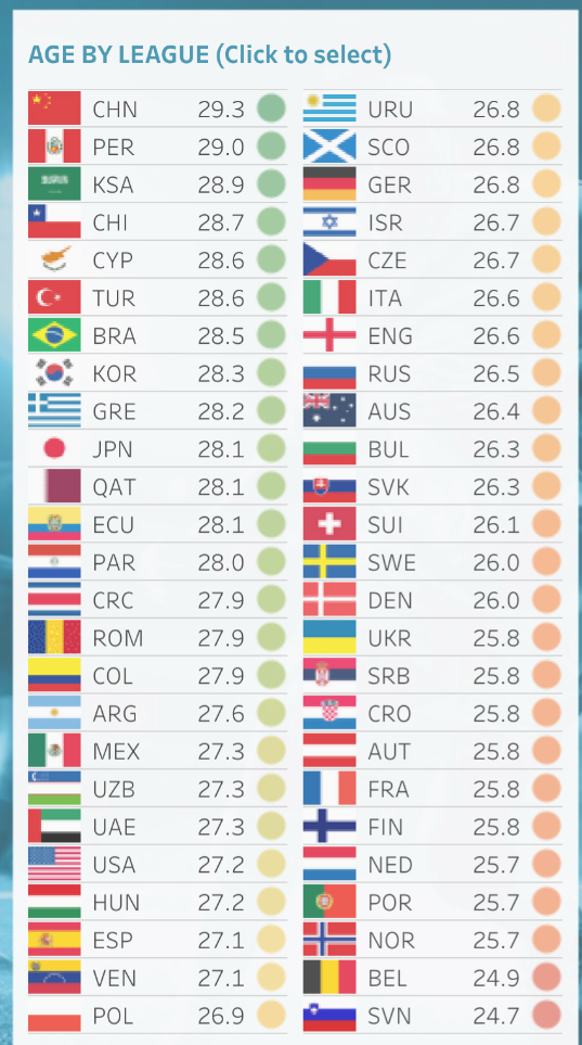 雷速体育9月5日讯 据瑞士足球天文台最新统计数据显示,中国的中超联赛是目前世界上平均年龄最大的联赛,以平均29.3岁的年龄居全球榜首。紧随其后的是秘鲁、沙特阿拉伯、智利和塞浦路斯。亚洲的日韩联赛平均年龄也在28岁以上。
